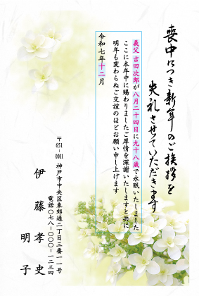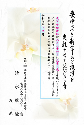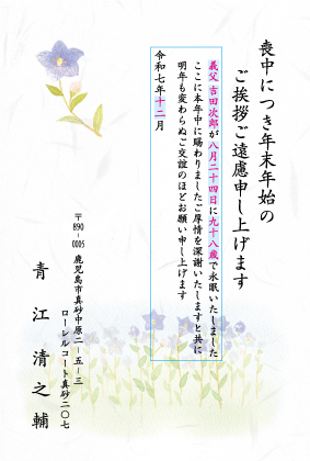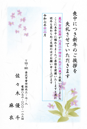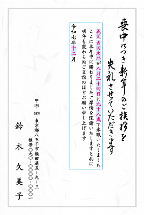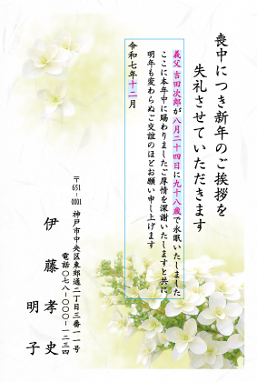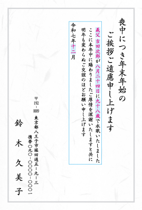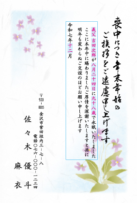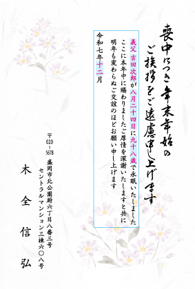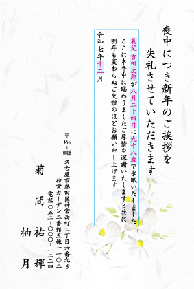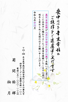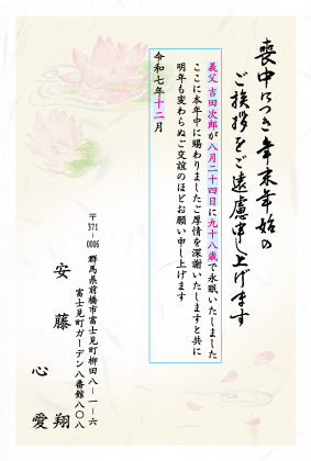 冒頭の挨拶文章が異なるデザインが選べます。下記印刷イメージの青枠内が対象です。